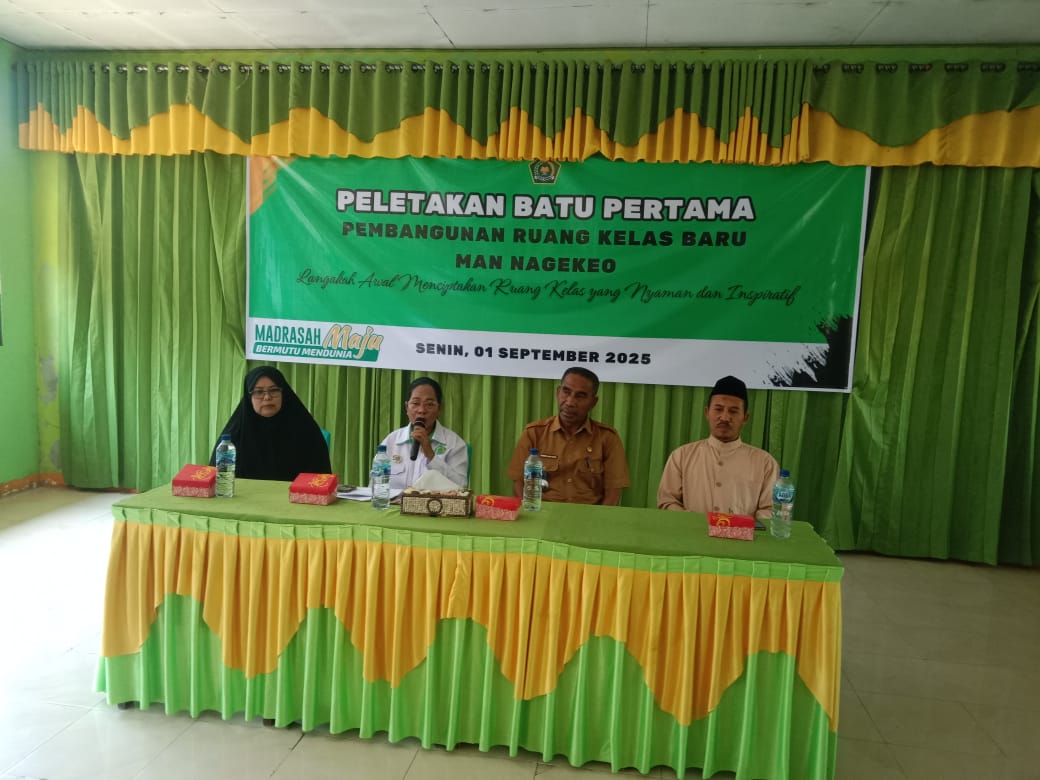 MAN Nagekeo (Humas) --- Madrasah Aliyah Negeri (MAN) Nagekeo menggelar acara peletakan batu pertama pembangunan gedung baru yang bersumber dari bantuan Surat Berharga Syariah Negara (SBSN) Tahun Anggaran 2025. Acara yang berlangsung di Aula MAN Nagekeo, Kecamatan Aesesa, Kabupaten Nagekeo itu dihadiri oleh pejabat pemerintah daerah, unsur tokoh masyarakat, tokoh agama, komite sekolah, serta seluruh guru dan pegawai MAN Nagekeo, Senin (1/9/2025). Suasana penuh keakraban dan kekhidmatan terasa ketika prosesi peletakan batu pertama dilakukan sebagai simbol dimulainya pembangunan yang dinantikan sejak lama.